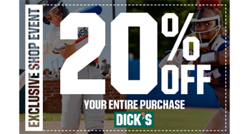 Our partner, DICK's Sporting Goods, is offering all of our players and families an exclusive discount of 20% off through the store on Friday August 15th through Monday August 18th. Be sure to grab all the things you will need for the upcoming season or get some things for back to school! To access these savings, please click the link below. The coupon is only valid on these dates and must be shown at the register to use.